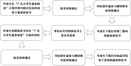 10. 毕业生在提交就业协议后,还需要经历 :院系审核--学校审核--学生下载打印纸质协议书--单位签章--学生在小程序上将盖好章的协议书回传—院系审核--学校审核--学生下载打印加盖印章的协议书(如单位有电子签章,系统将自动回传协议书)