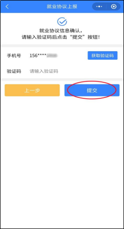 确认签名后点击“下一步”,输入手机号获取验证码,点击“提交”即可完成就业协议的填报。