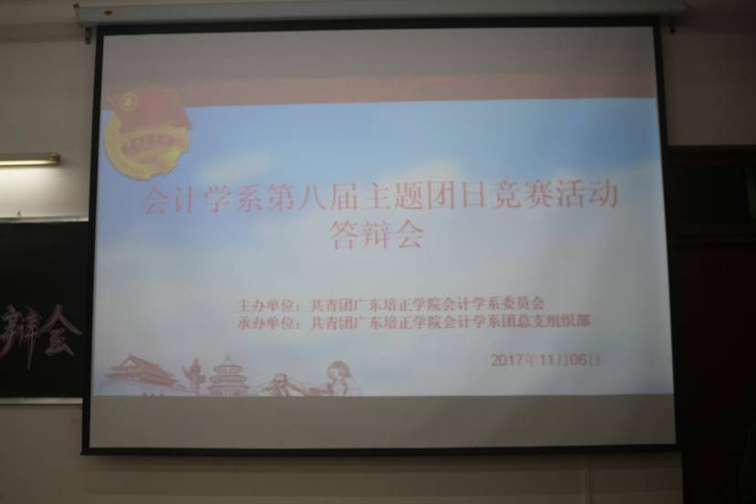 本网讯(学习部 林桂豪 资讯部 吴泽娜)2017年11月6日中午,我系于3107课室举行了由共青团广东培正学院会计学系委员会主办,共青团广东培正学院会计学系团总支组织部承办的第八届主题团日竞赛活动答辩会。出席本次答辩会的评委有:系党总支副书记、办公室主任陈双红,艺术设计系团总支书记丁小琴,系团总支书记金石榴,辅导员李鹏老师、黄锦清老师和高格老师。同时出席答辩会的还有校团委、各院系团总支和我系团总支主要学生干部,以及各班答辩代表团。