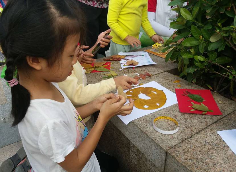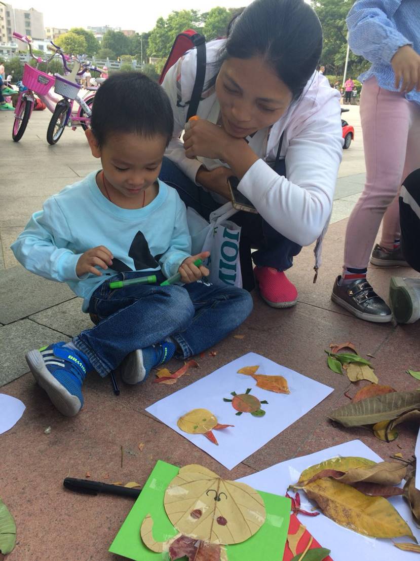 此外,志愿者们带领大家利用落叶作画,拼接的过程中,各种形状的叶子在我们手里变成了一个个生动有趣的动物,小朋友们也拥有了一个自己制作的、独一无二的手工艺品。落叶作画,不仅提高了小朋友的想象力和实践能力,更是让她们拥有废物利用的意识。传播绿色能量,只因你行动!