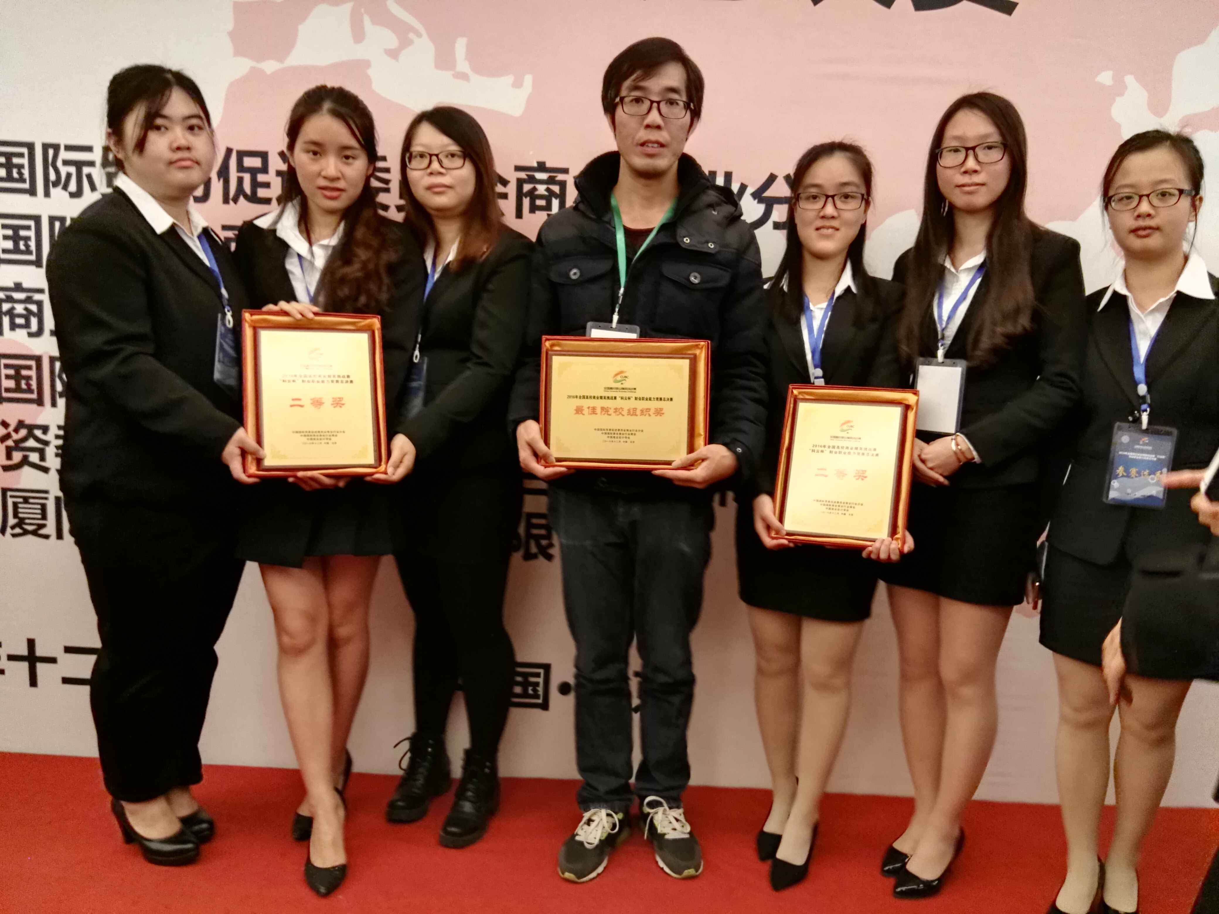 我系派出两支代表队参加总决赛,经过精心的准备,选手们在比赛中沉着稳定,发挥出色,喜获两个二等奖。获得二等奖的同学有彭晓悦、郑晓婷、谢莹、林曼珊、黄珂瑶、卢茜茜。另外广东培正学院在组织比赛中表现出色,荣获“最佳院校组织奖”,谭洪益老师获得“优秀指导教师奖”。