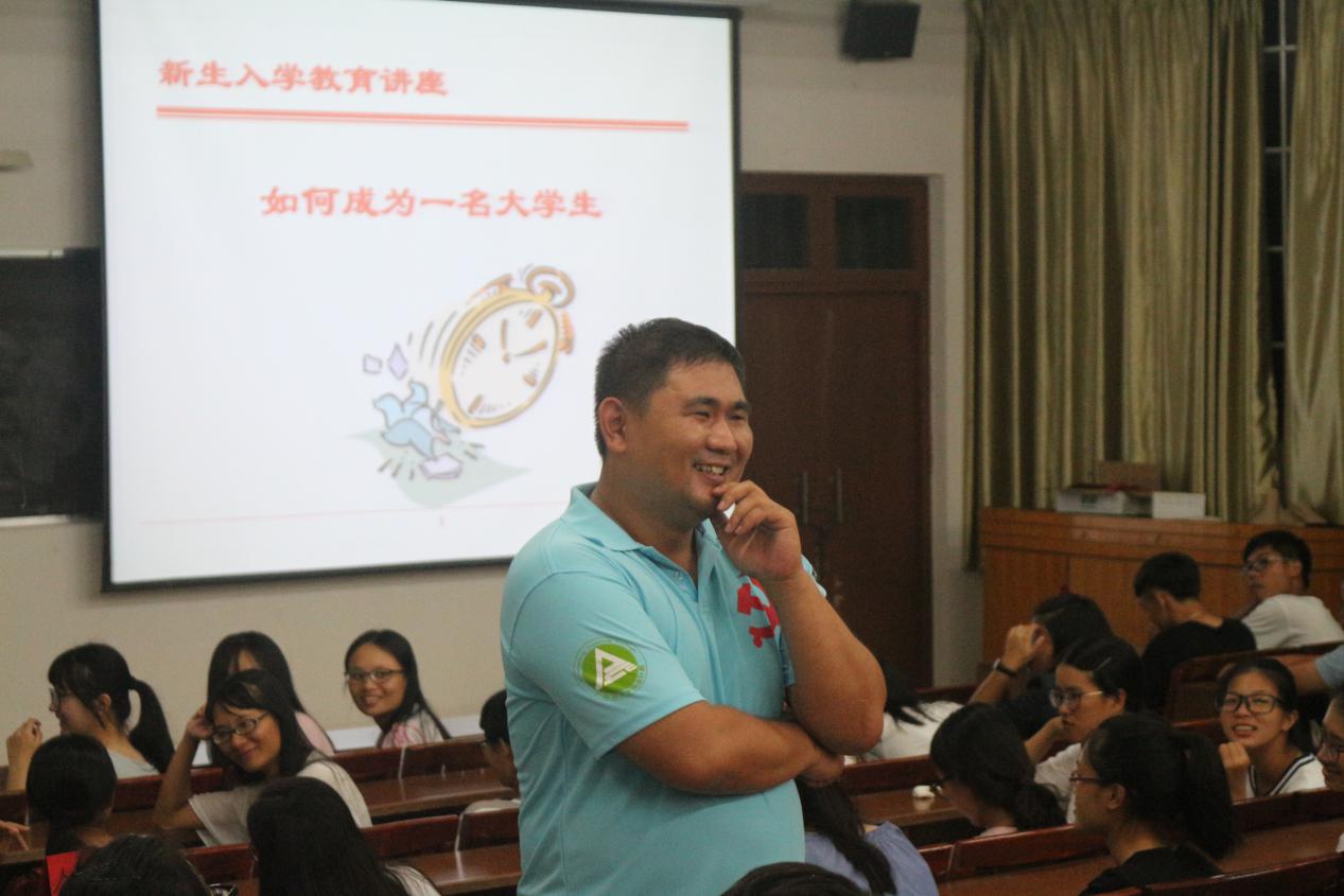 讲座开始,首先,由周瑜老师主讲。他以诙谐的方式进行了自我介绍,调动起全场的气氛。接着,分别从“师姐说”、辅导员工作、专业、社团、“培正之变”和心态转变等六个方面,详细阐述大学生活与以往校园生活不同的内容,希望同学们能够适应新环境,积极面对成长路上遇到的困难;并用具体的案例讲解了大学生在友情、爱情等关系中常见的困扰和处理方法,通过结合心理理论知识与教育实践经验来鼓励新生们积极的认识自我,处理好人际关系,及早树立大学的目标,确立人生的方向,并为之付出行动。