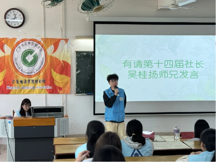 吴桂扬社长总结其过去的经历,表示在任期间尽心尽力完成了社团布置的任务,师兄勉励同学们共同努力,一起进步。其次,师兄十分感谢各干部干事的精心配合,在过去的社团活动中,各部门干部与干事相互协作学习,共同出色地完成了任务。最后师兄表示在大一大二这段时期要脚踏实地,行稳致远并衷心地祝愿同学们能在大学生活留下浓墨重彩的一笔,前程似锦,不负韶华。