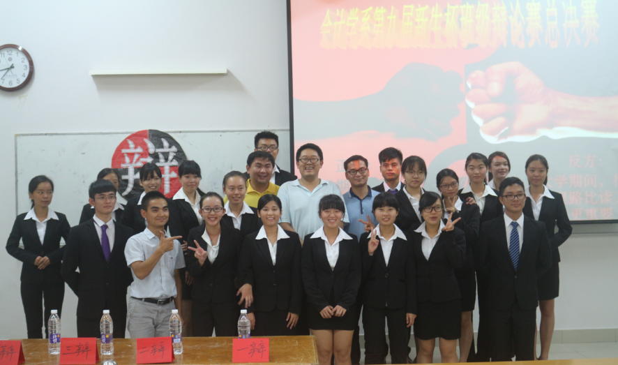 本网讯(学习部 王少丹 资讯部 黄嘉美)2015年10月22日晚上19:00,由会计学系团总支主办的第九届新生杯班级辩论赛决赛在校4417举行,由15级财务管理1班和15级财务管理2班打响这场巅峰之战。出席本场比赛的评委分别是经济学系的陈汉威老师、学生处劳开准老师以及会计学系李鹏老师。另外,到场的嘉宾有会计学系团总支、学生会指导老师金石榴老师、艺术系队长罗师兄和法学系副队长钟师兄。