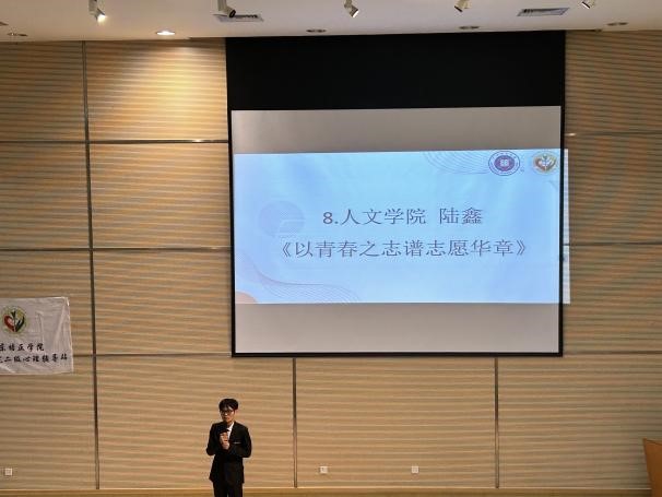 金石榴老师上台致词。金石榴老师表达了对心理演讲比赛的肯定。他说到,此次比赛旨在回顾在抗疫期间的英雄人物和感人事迹,弘扬和传播社会正能量,对学生心理健康能够起到积极作用。金石榴老师预祝各位选手能在此次比赛中 获得优异成绩。